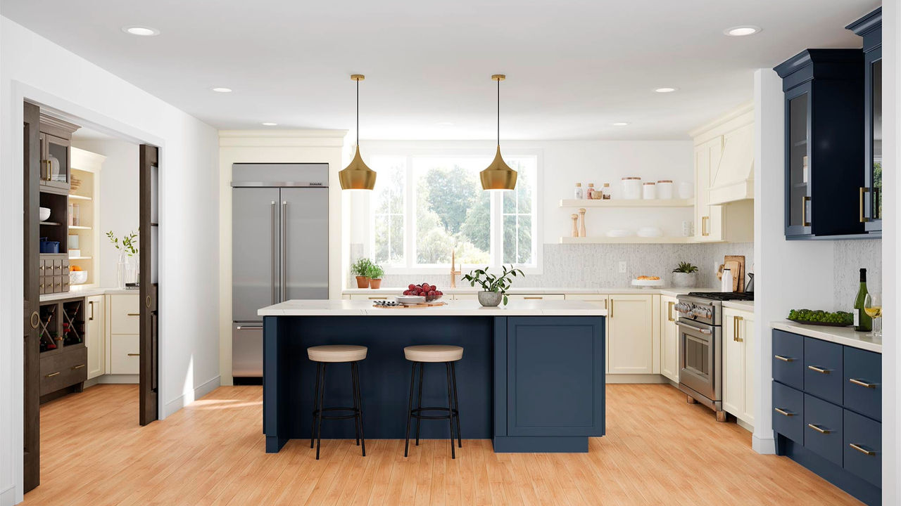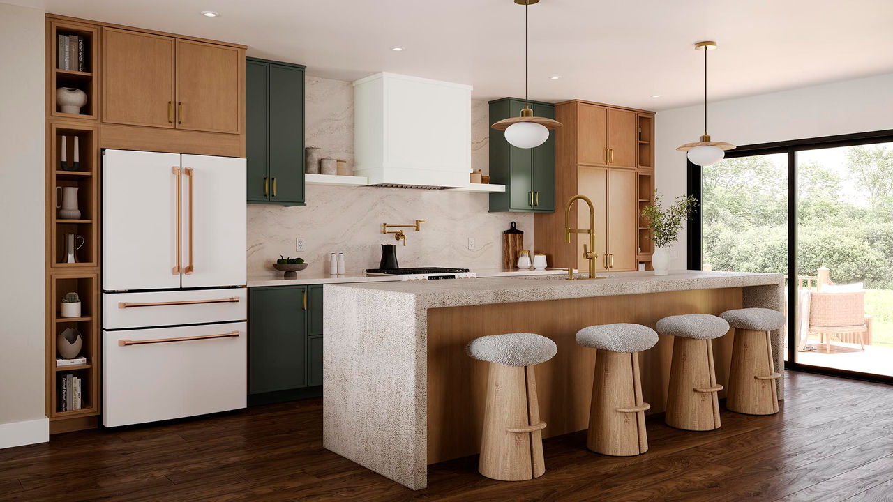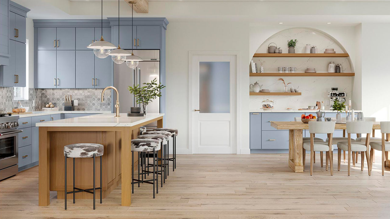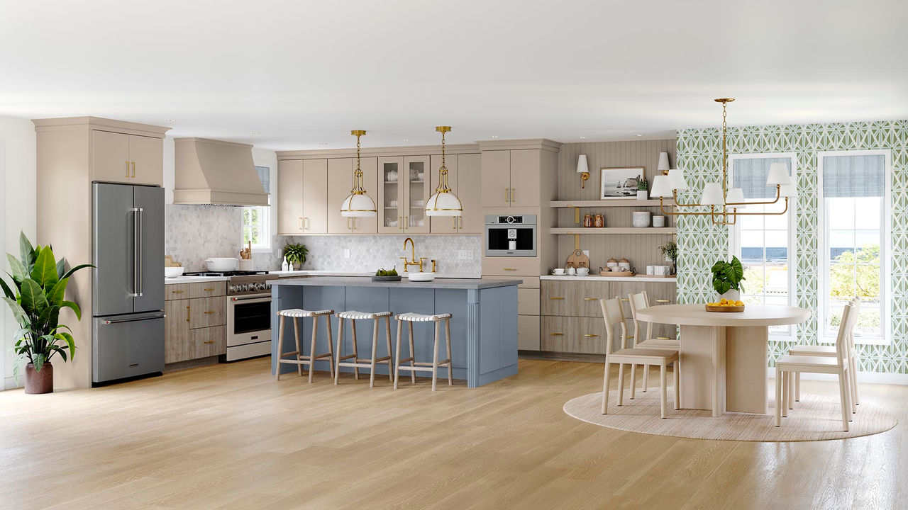 We're seeing a shift from two-tone kitchens to tri-tone kitchens. These combinations typically consist of a neutral finish, with a bold pop of color, and a wood-tone finish to ground the space.