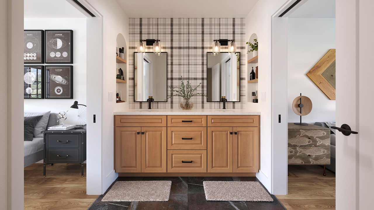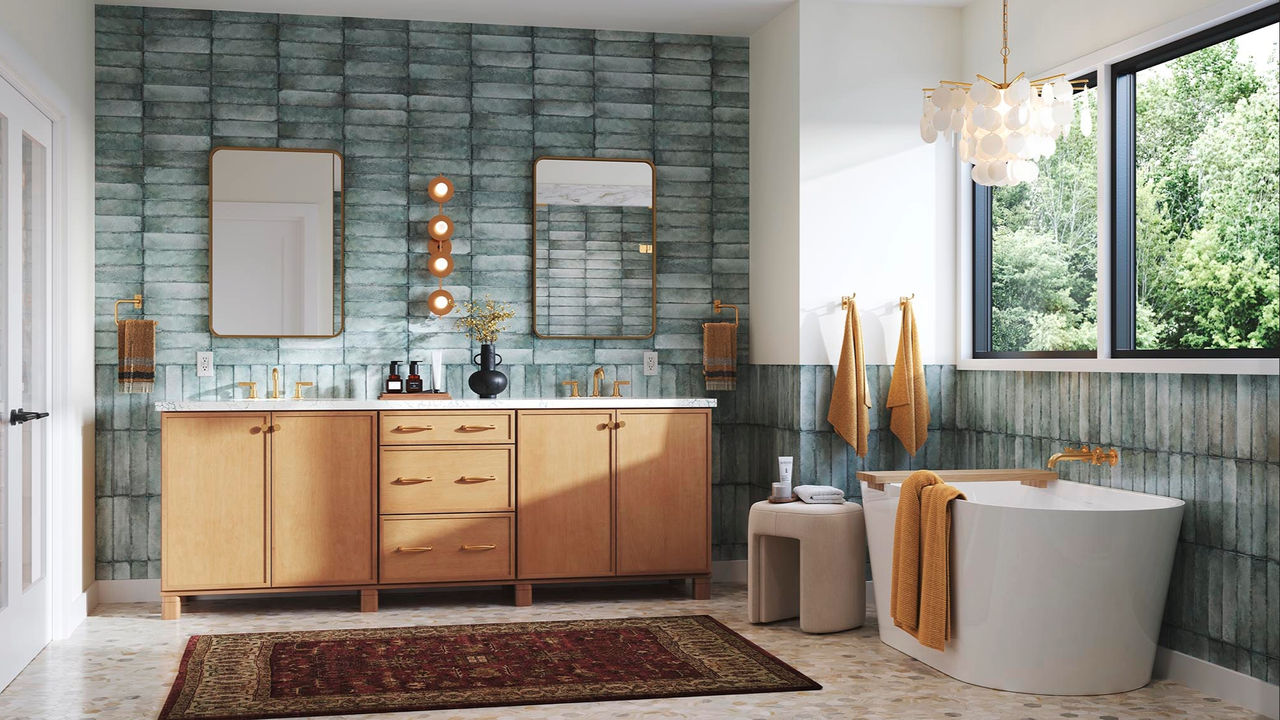 Incorporate a warm wood tone in the bathroom to create a spa-like feel. Gold hardware adds a touch of luxury, while textured tile adds visual interest and allows the warm cabinets to shine.